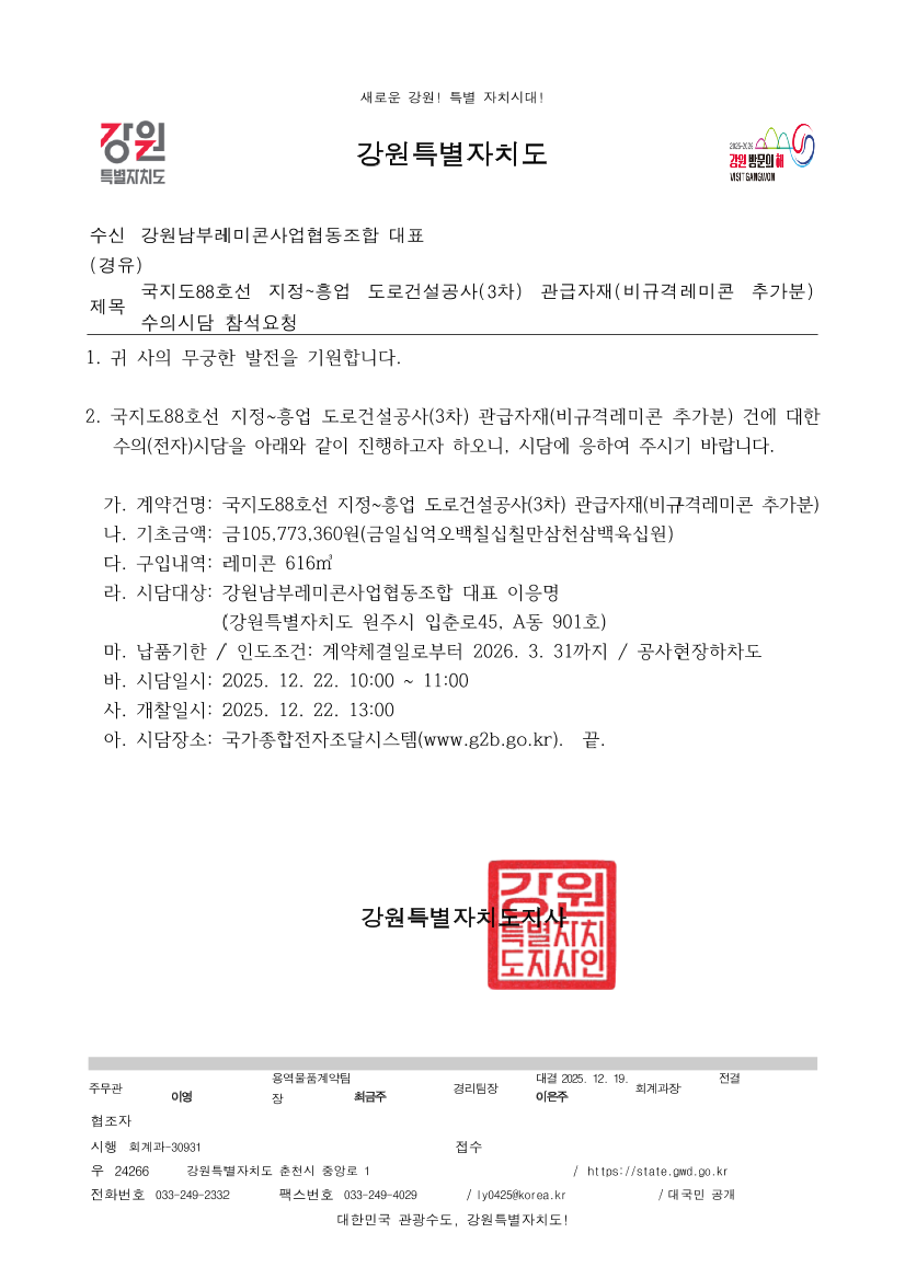 국지도88호선 지정~흥업 도로건설공사(3차) 관급자재(비규격레미콘 추가분) |