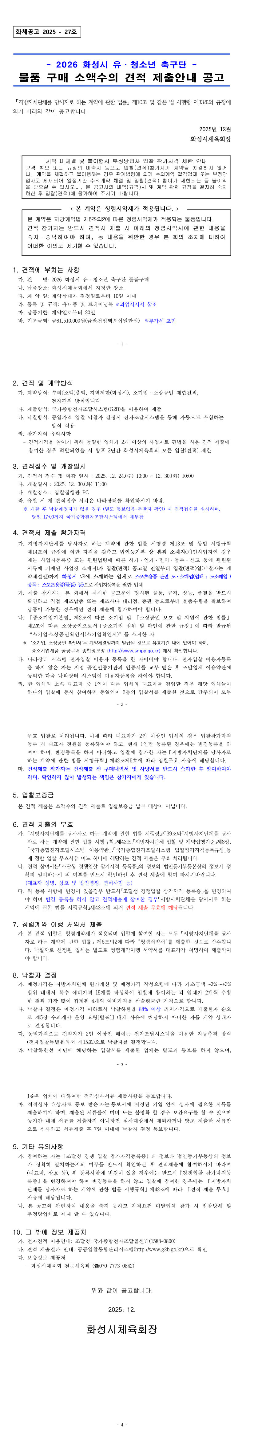 2026 화성시 유.청소년 축구단 물품구매 소액수의 견적 제출안내 공고 |