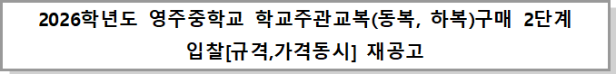 「지방자치단체를 당사자로 하는 계약에 관한 법률 시행령」(이하 “지방계약법 시행령”이라 한다.) 제18조(2단계 입찰)의 규정에 따라 2026학년도 영주중학교 학교주관교복(동복, 하복)구매 업체 선정을 위해 다음과 같이 재공고합니다.