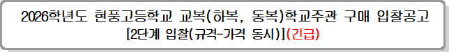 「지방자치단체를 당사자로 하는 계약에 관한 법률 시행령」 제18조(2단계 입찰 품질·가격 분리 동시 입찰)규정 에 의거 2025학년도 현풍고등학교 교복(동·하복) 학교주관 구매업체 선정을 위해 다음과 같이 입찰 공고 합니다.