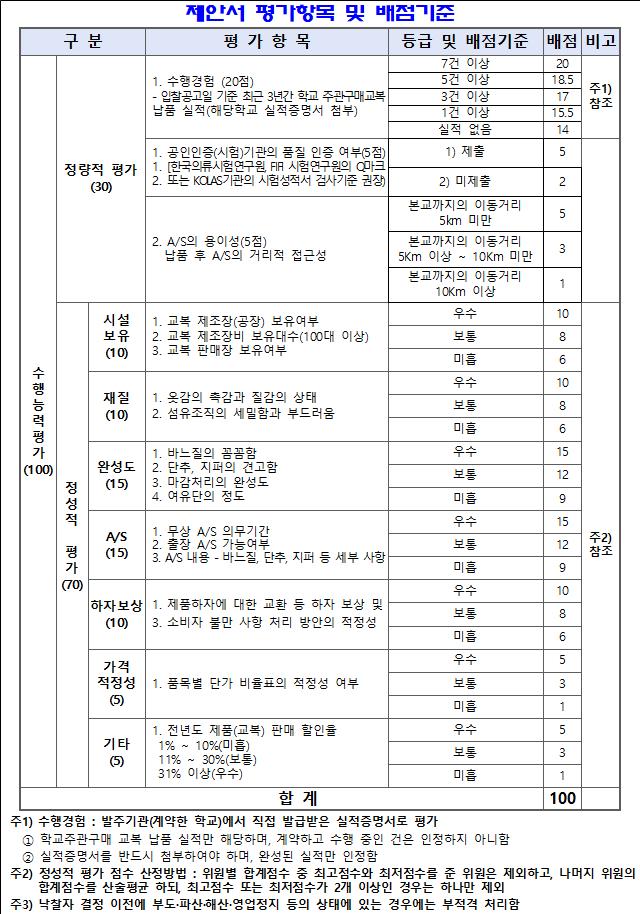 - 전년도 제품(교복) 납품을 희망할 경우, 제안서 제출 시 교복 1벌의 할인율, 계약 시 전년도 제품 1벌의 품목별 가격(품목별 단가표)을 제시