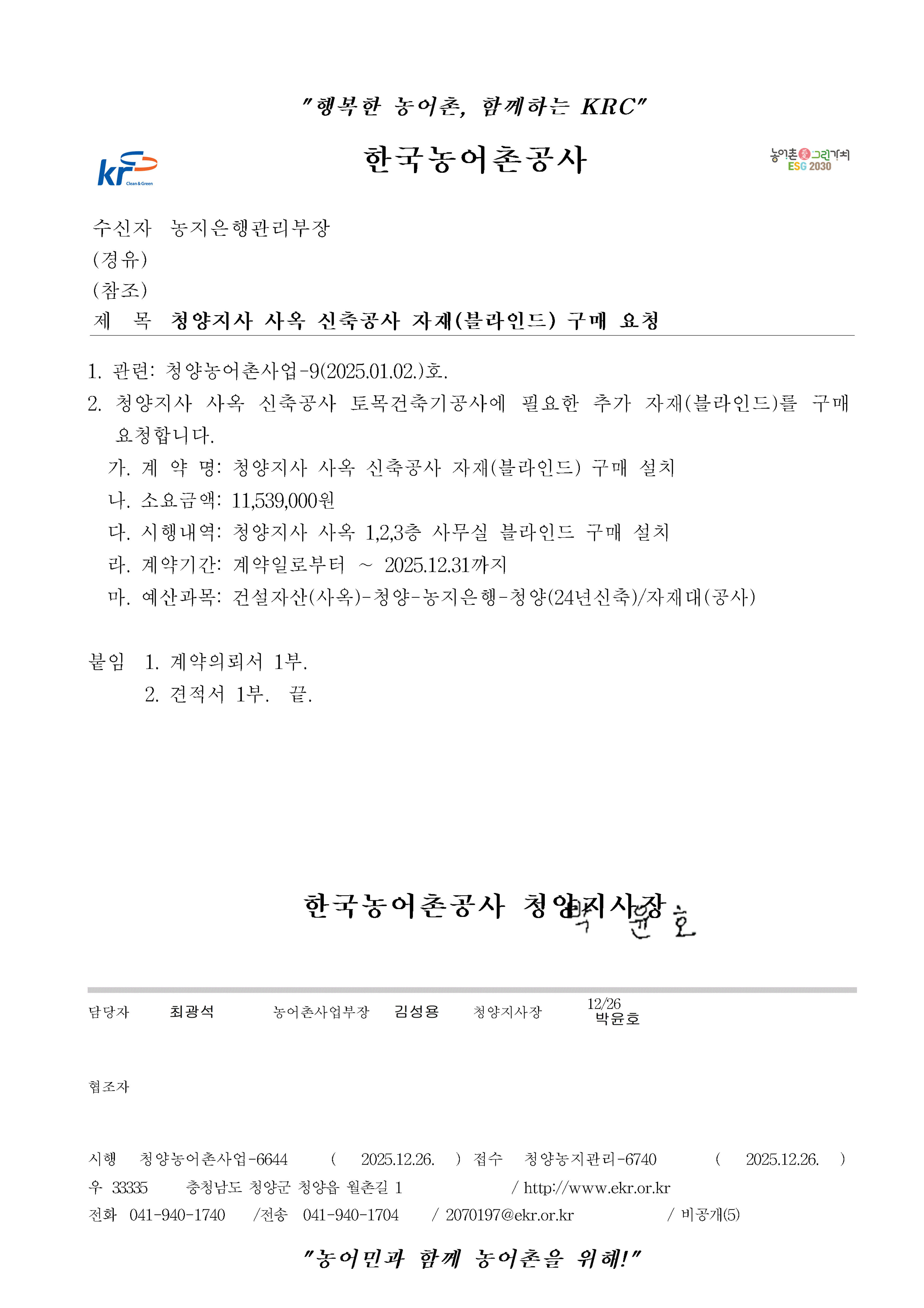 청양지사 사옥 신축공사 자재(블라인드) 구매 |