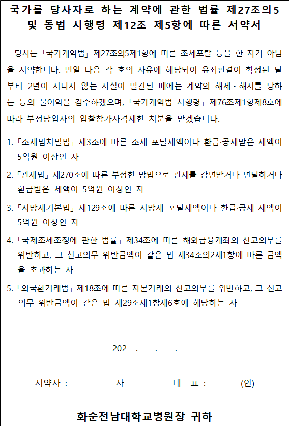 이 계약은 「국가를 당사자로 하는 계약에 관한 법률」 제5조의2에 따른 청렴계약제가 적용됩니다. 입찰자는 반드시 입찰서 제출 시 아래 청렴계약서에 관한 내용을 숙지·승낙하여야 하며, 동 내용을 위반한 경우 화순전남대학교병원의 조치에 대해서 어떠한 이의도 제기할 수 없습니다.