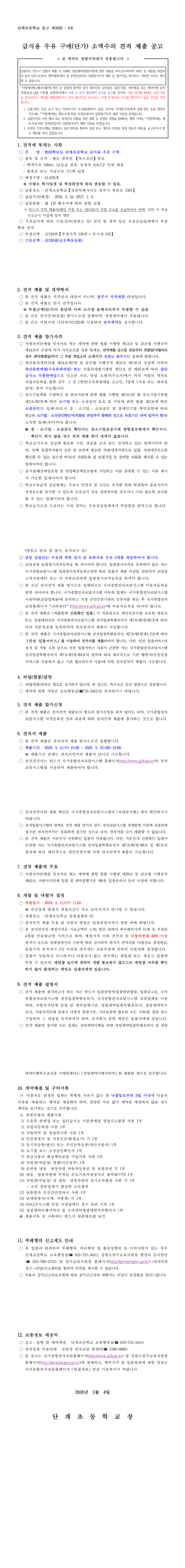2026학년도 단계초등학교 급식용 우유 구매 소액수의 견적 제출 공고 |