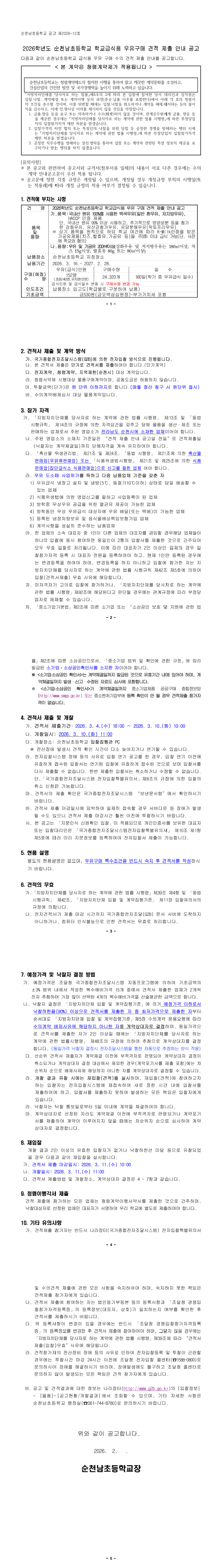 2026학년도 순천남초 학교급식용 우유 구매 견적 제출 안내 공고 |