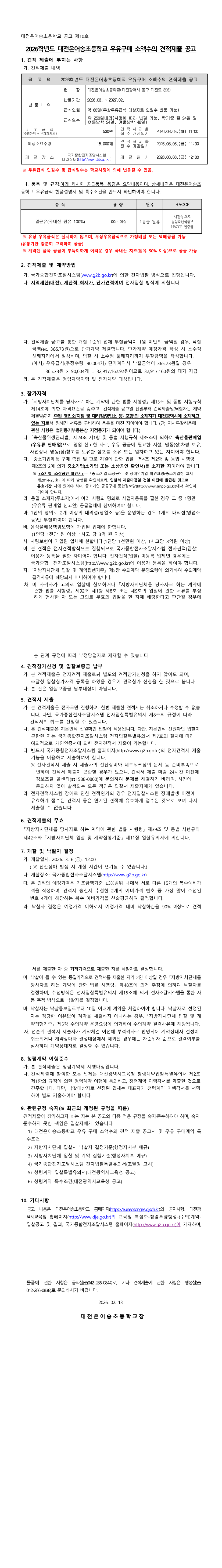 2026학년도 대전은어송초등학교 우유 구매 소액수의 견적제출 공고 |