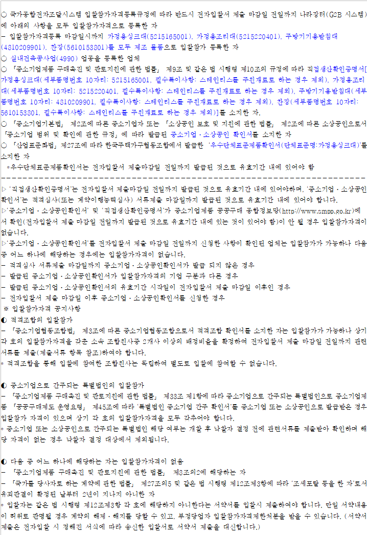 시 해당 물품명 또는 계약 명에 “가정용싱크대, 가정용조리대, 주방기기용받침대, 찬장(주방가구)가 명시되어 있어야함)