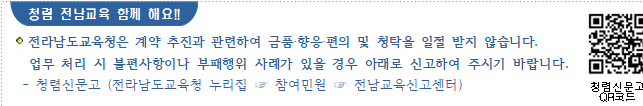 ◈ 계약담당 공무원이 금품․향응 등을 요구할 경우에는 전라남도교육청홈페이지 참여민원-전남교육신고센터- 공직자부조리란에 신고하여 주시기 바랍니다.