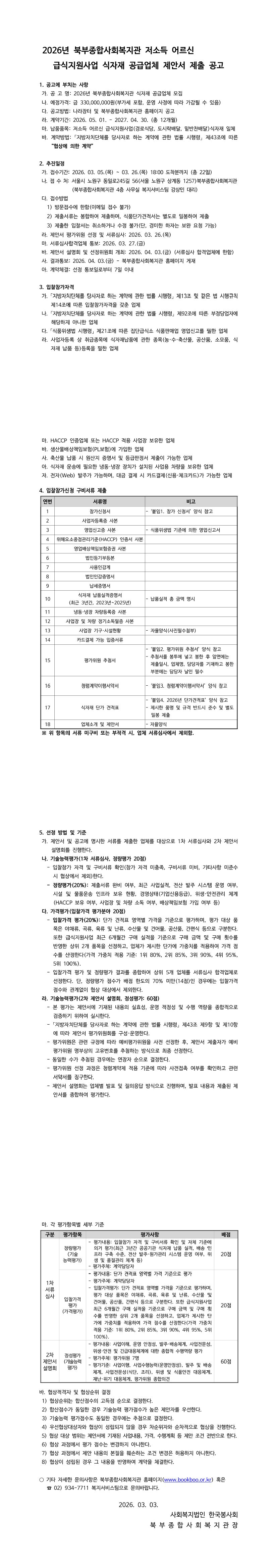 2026년 북부종합사회복지관 급식지원사업 식자재 공급업체 공급입찰 |