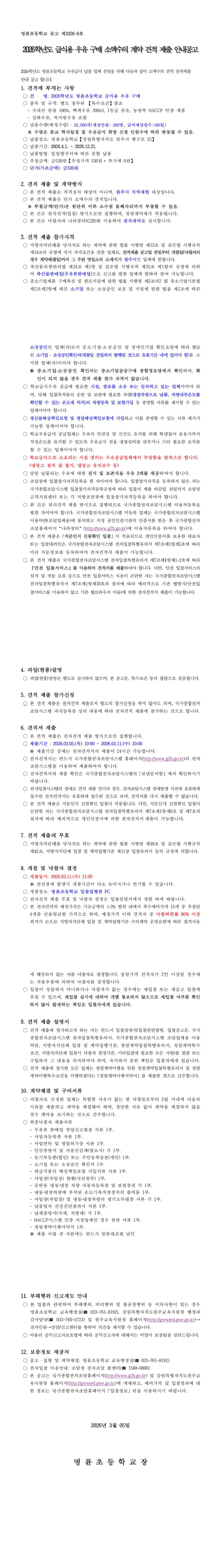 2026학년도 명륜초 급식용 우유 구매 소액수의 계약 견적 제출 안내 공고 |