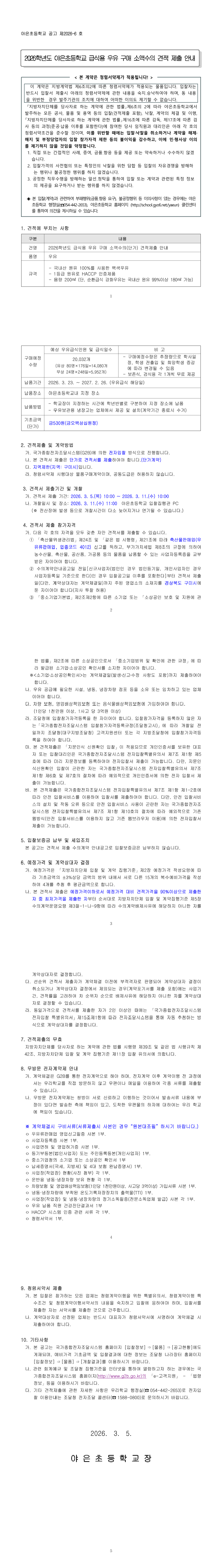 2026학년도 야은초등학교 학교급식용 우유 구매 소액수의 견적 제출 안내 공고 |