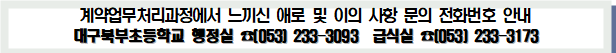 - 물품규격 및 납품조건에 관한 사항:우리학교 급식실(☎053-233-3173)