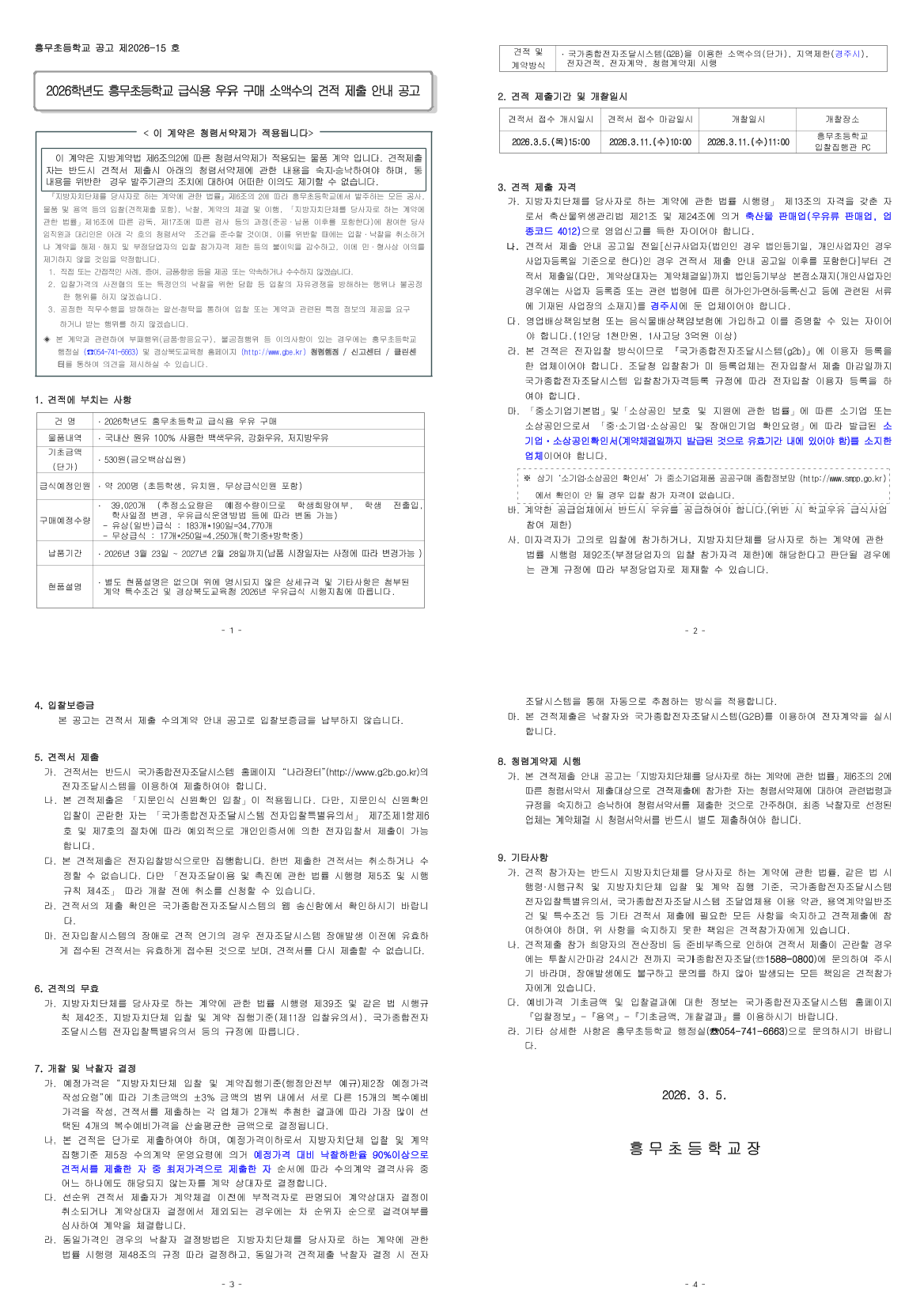 2026학년도 흥무초등학교 급식용우유 구매 소액수의 견적 제출 안내 공고 |