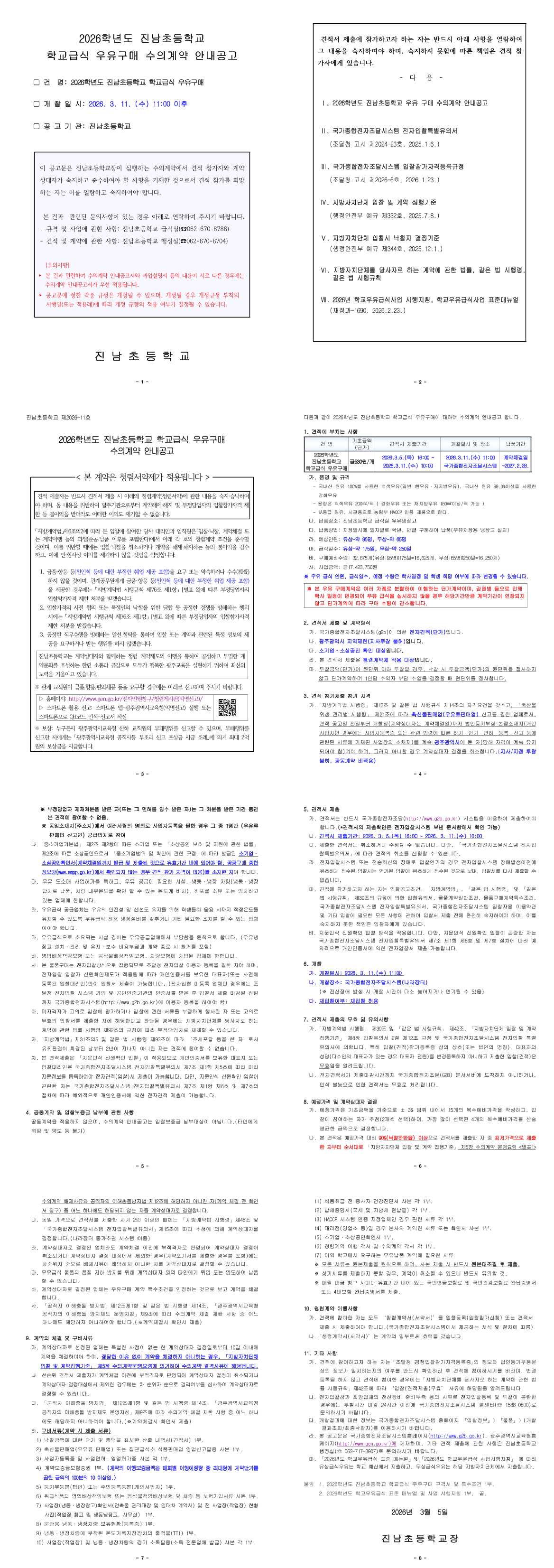 2026학년도 진남초등학교 학교급식 우유구매 수의계약 안내 공고 |