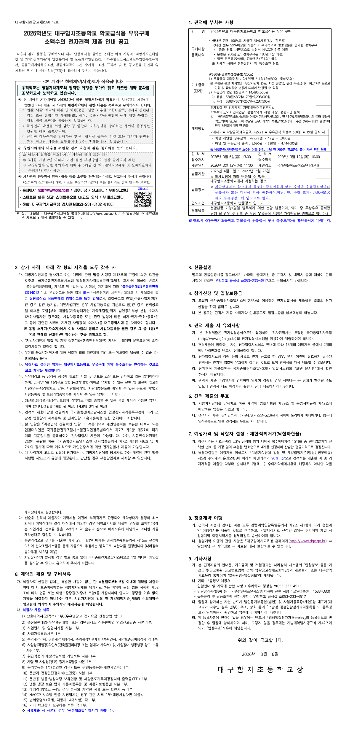 2026학년도 학교급식용 우유구매 소액수의(단가)견적제출 안내공고 |
