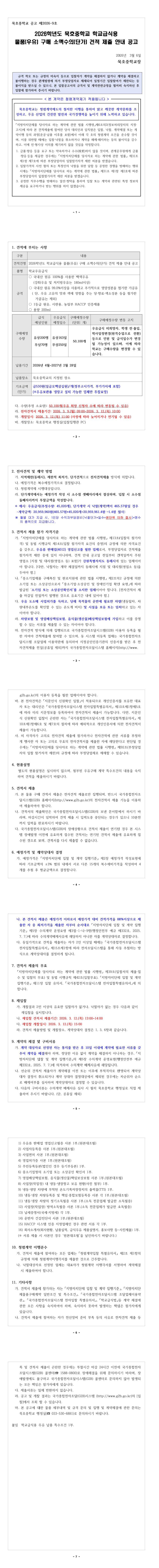 2026학년도 묵호중학교 학교급식용 물품(우유) 구매 소액수의(단가) 견적 제출 |