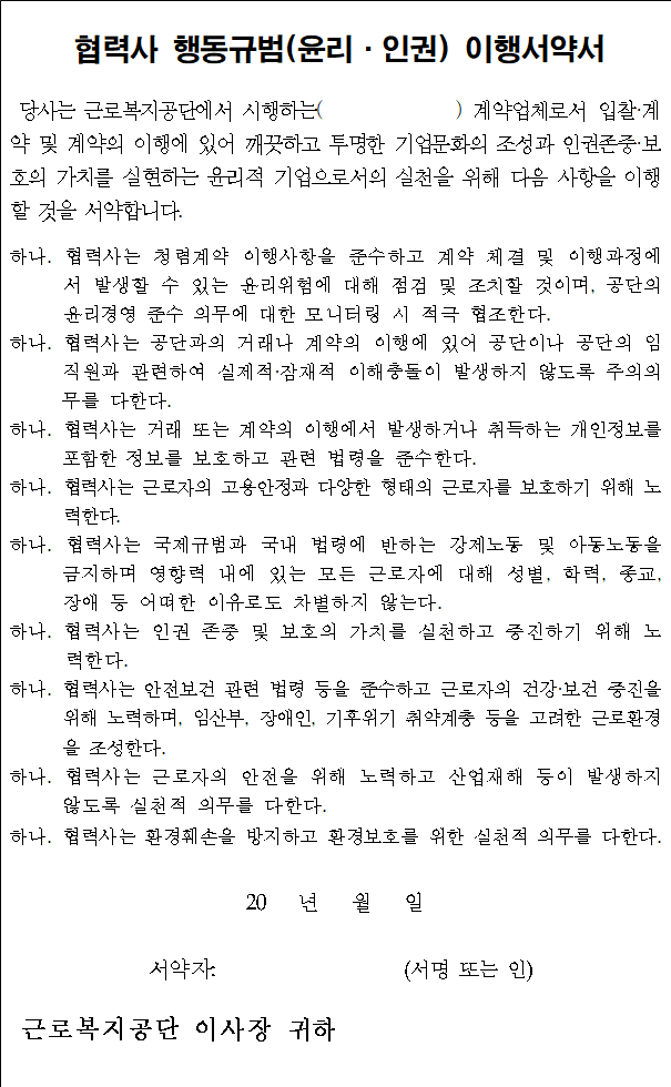 다만, 계약 체결시에는 낙찰업체의 대표자가 서명한 ‘근로자 권리보호 서약서’를 제출하여야 합니다.