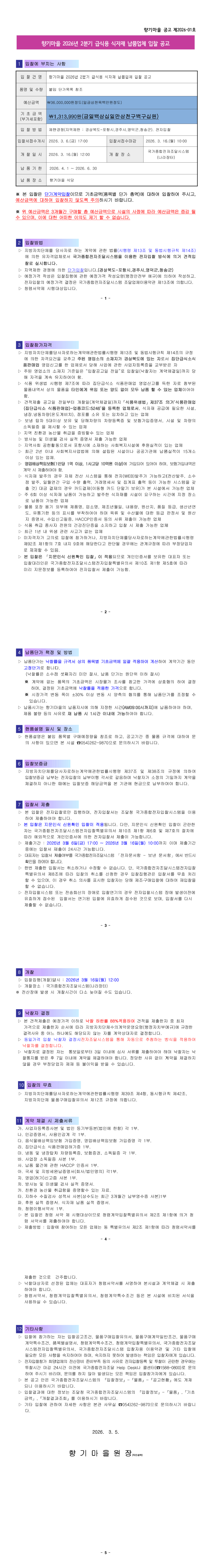 향기마을 2026년 2분기 급식용 식자재 납품업체 입찰 공고 |