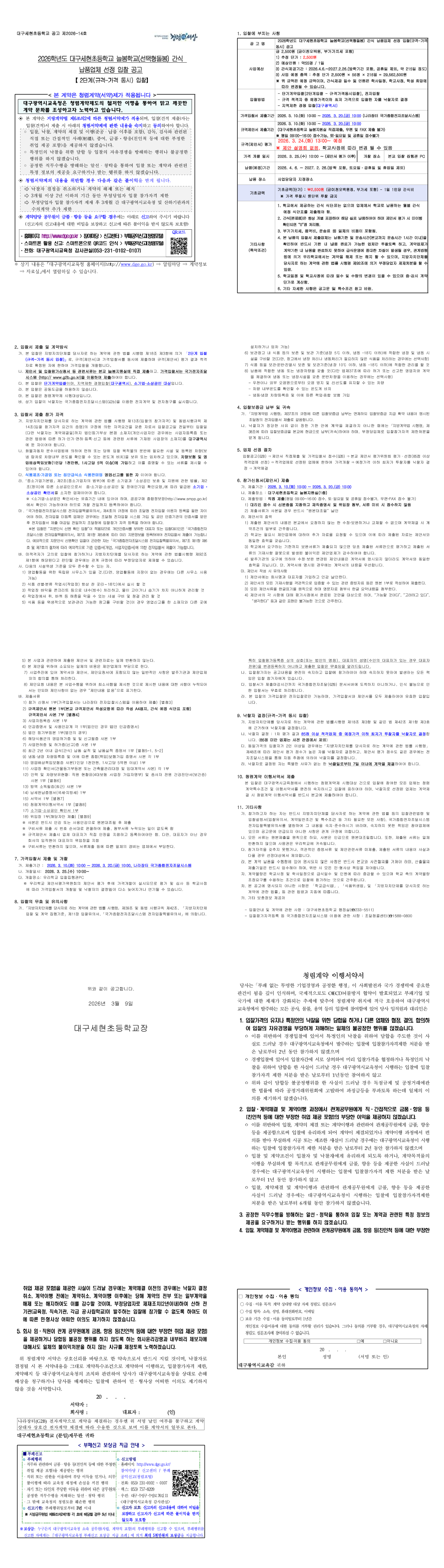 2026학년도 대구세현초등학교 늘봄학교(돌봄교실) 간식 납품 업체 선정을 위한 2단계(규격-가격동시) 입찰 공고 |