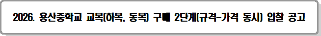 「지방자치단체를 당사자로 하는 계약에 관한 법률 시행령」제18조(2단계 입찰 규격-가격 동시 입찰)규정에 따라 2026학년도 용산중학교 교복(하복, 동복) 학교주관 구매 업체 선정을 위해 다음과 같이 공고합니다.