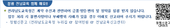 사. 본 입찰과 관련하여 부패행위, 비리행위 및 불공정행위 등 이의사항이 있는 경우 감사담당관실(☏061-260-0277) 및 홈페이지(https://www.jne.go.kr→전라남도교육청/참여민원/전남교육신문고)에 신고하여 주시기 바랍니다.