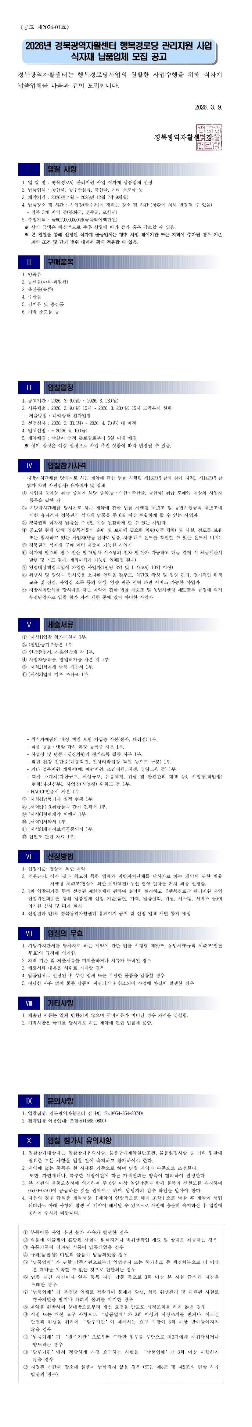 2026년 경북광역자활센터「행복경로당 관리지원 사업」식자재품 납품업체 입찰 공고 |