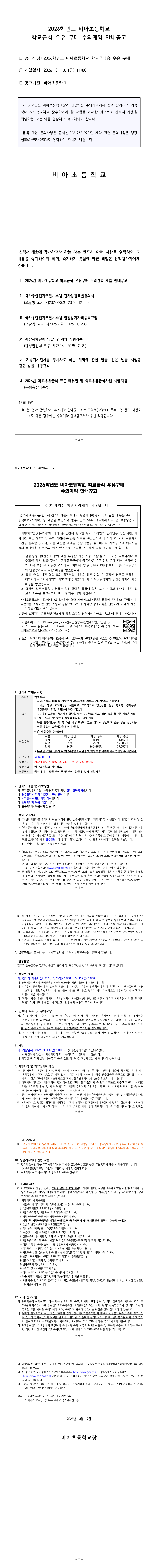 2026학년도 비아초등학교 학교급식 우유구매 수의계약 안내공고 |