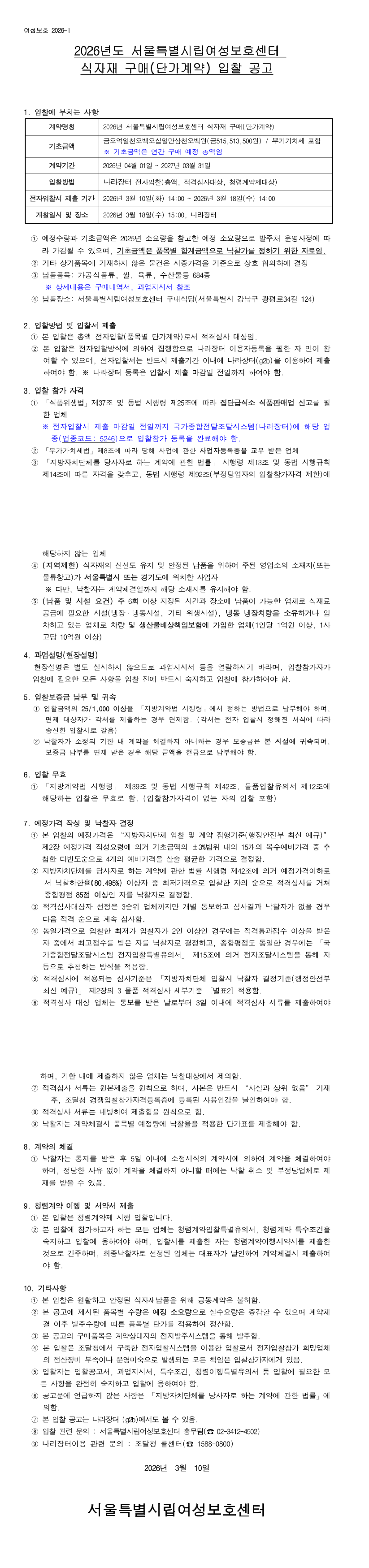 2026년 서울특별시립여성보호센터 식자재 납품업체 입찰공고 |