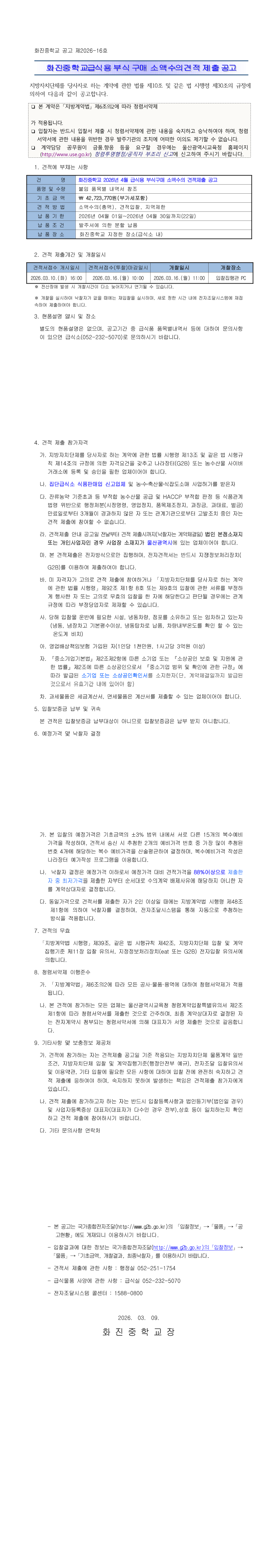 2026년 4월 화진중학교 급식용 구식구매 소액수의 견적제출 안내공고 |