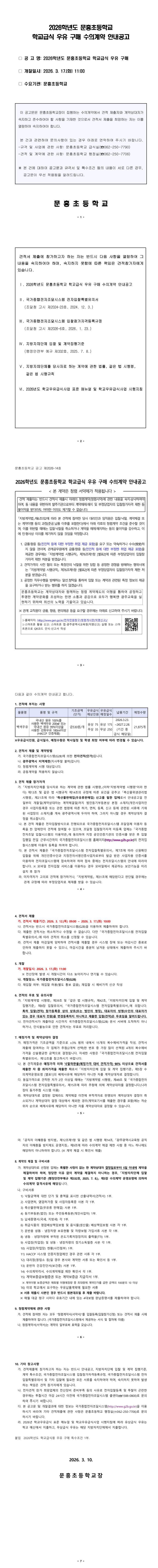 2026학년도 문흥초등학교 학교급식 우유 구매 수의계약 안내공고 |