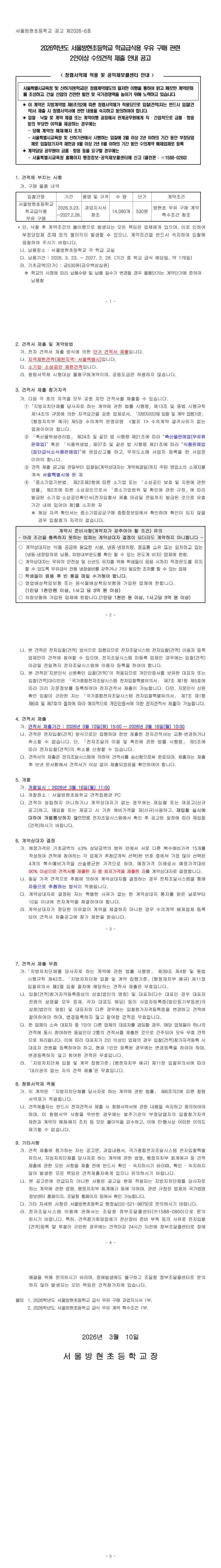 2025학년도 서울방현초등학교 학교급식용 우유 구매관련 2인 이상 수의견적 제출 안내 공고 |