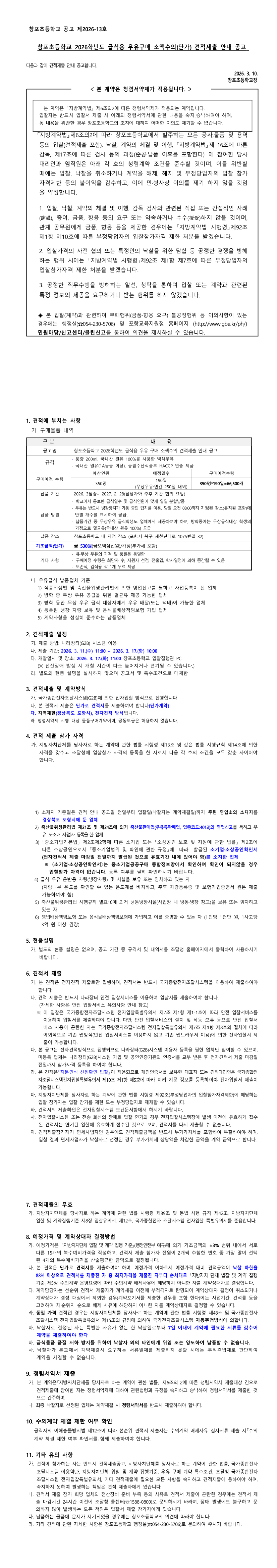 창포초등학교 2026학년도 급식용 우유 구매 소액수의 견적 제출 안내 공고 |