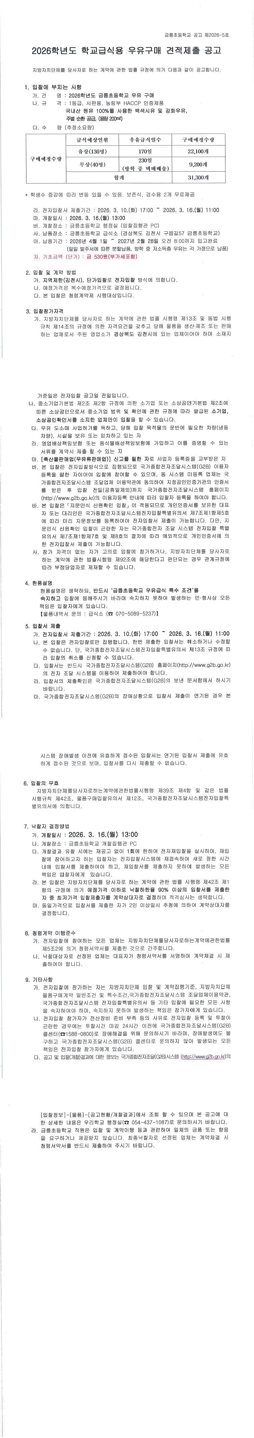 김천금릉초등학교 2026학년도 학교급식용 우유구매 견적 제출 공고 |