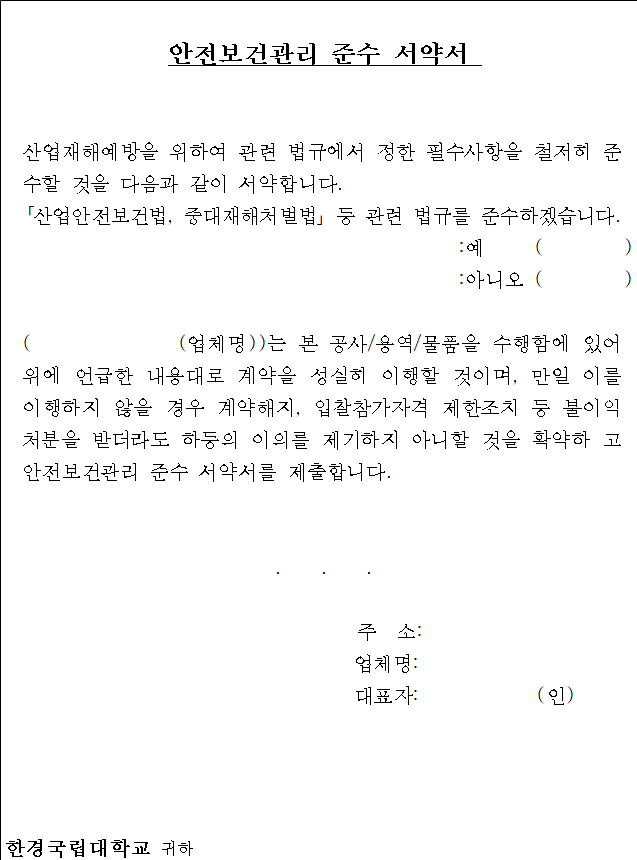 11.2. 입찰에 참여하는 자는 중대재해 예방을 위한 「안전보건관리 준수 서약서」를 숙지하신 후 입찰에 응하여야 하며, 입찰서를 제출한 자는 「안전보건관리 준수 서약서【붙임3】」를 제출한 것으로 간주합니다. 다만 계약 체결 시에는 낙찰업체의 대표자가 서명한 서약서를 제출해야 합니다.