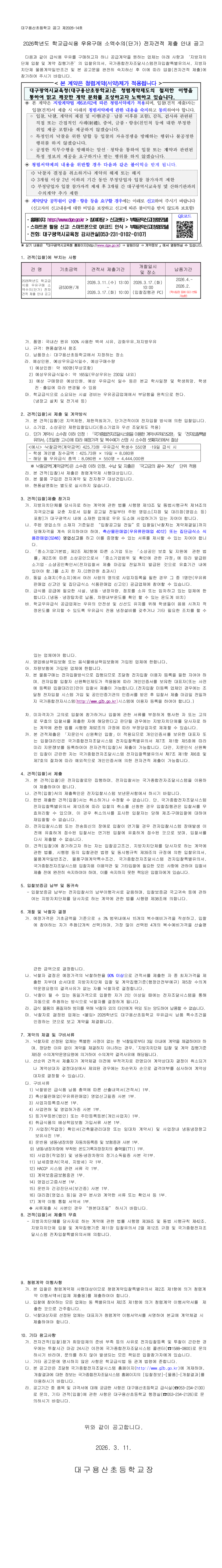 2026학년도 학교급식용 우유구매 소액수의(단가) 전자견적 제출 안내 공고 |