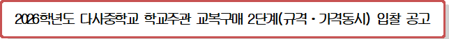 「지방자치단체를당사자로하는계약에관한법률시행령」제18조 3항(2단계 입찰)규정에 의거 2026학년도 다사중학교 학교주관 교복구매 업체를 선정하기 위한 입찰을 다음과 같이 공고합니다.