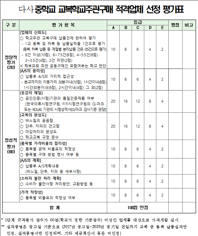 나. 우리 학교에서 제시한 「2026학년도 교복 사양서」 대로 제작 및 납품을 할 수 있고, 「2026학년도 1학년 교복 구매 계약 특수조건」을 이행할 수 있는 업체이어야 하며, 본교 교복 제 작·판매 후 A/S(1년 무상)가 가능한 업체여야 합니다.(단, 사용자 귀책사유로 인한 파손 등의 경우 유상 A/S 처리가 원칙이며, 업체와 협의하여 A/S 진행)