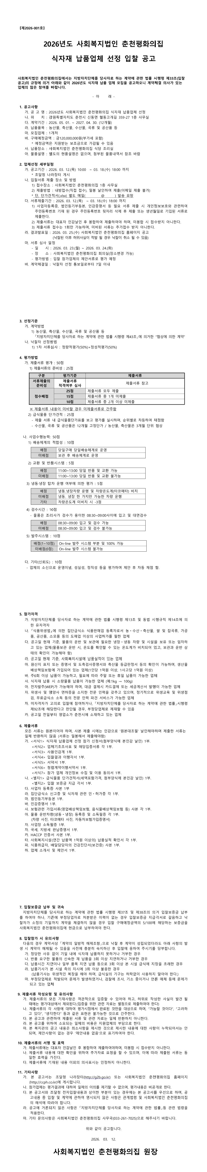 2026년 춘천평화의집 식자재 납품업체 선정 입찰 공고 |