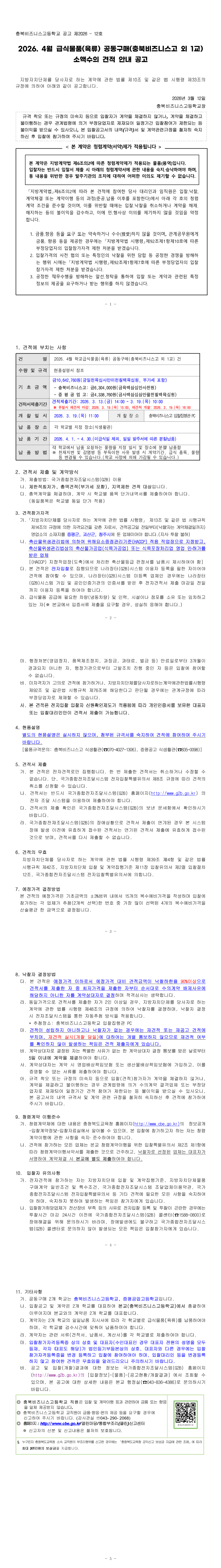 2026. 4월 학교급식물품(육류) 공동구매(충북비즈니스고 외 1교) 소액수의 견적 공고 |