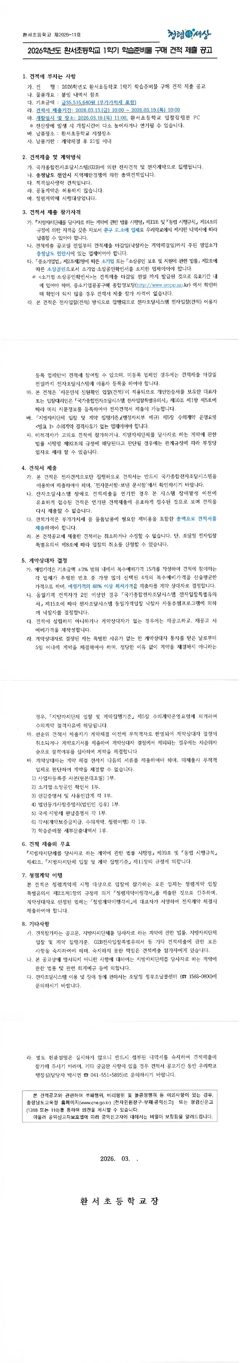 2026학년도 환서초등학교 1학기 학습준비물 구매 소액수의 견적제출 공고 |