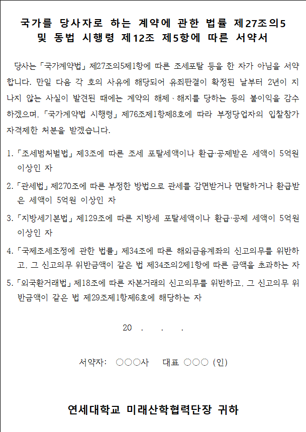 13-6. 본 기관은 윤리경영을 실천하고 있습니다. 본 입찰 및 계약과 관련하여 담당 직원이 금품, 향응 등 부당한 요구를 할 경우 윤리경영담당담당관(033-760-5107, clean_mirae@yonsei.ac.kr)에게 신고하여 주시기 바랍니다.