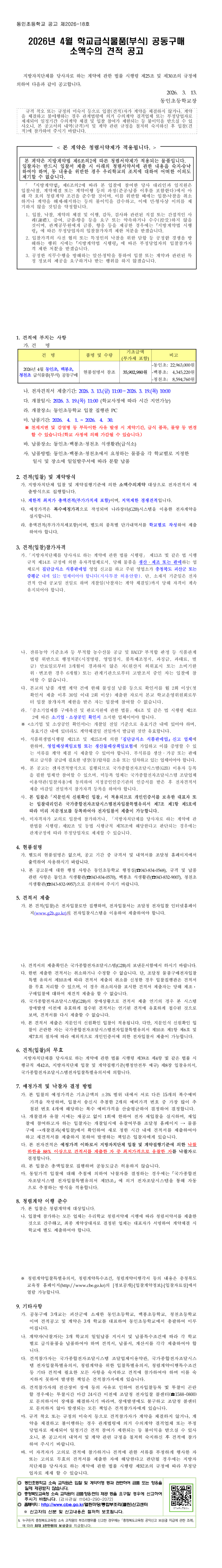 2026년 4월 동인초 외 2교(백봉초, 청청초) 학교급식물품(부식) 공동구매 소액수의 견적공고 |
