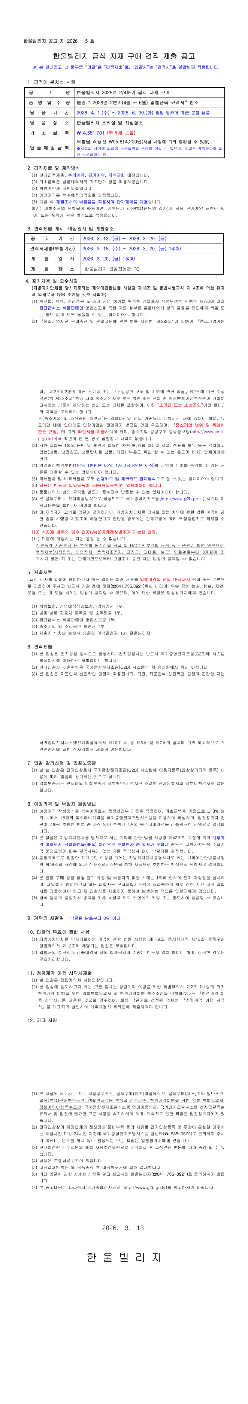 한울빌리지 2026년 2/4분기 급식 자재 구매 |