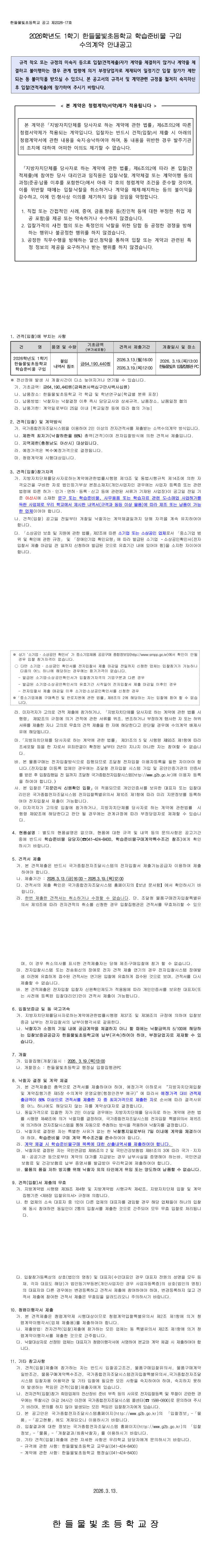 2026학년도 1학기 한들물빛초등학교 학습준비물 구입 수의계약 안내공고 |