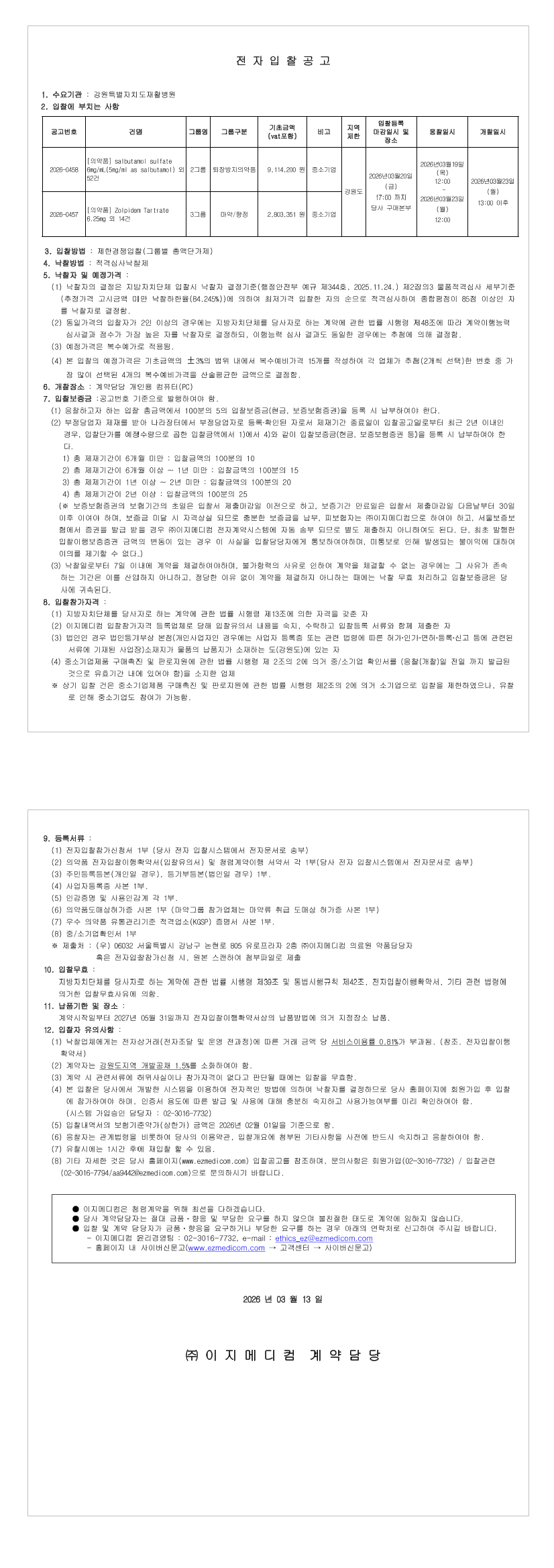 2026년 강원특별자치도재활병원 정규 의약품 구매 입찰 공고(2차) |