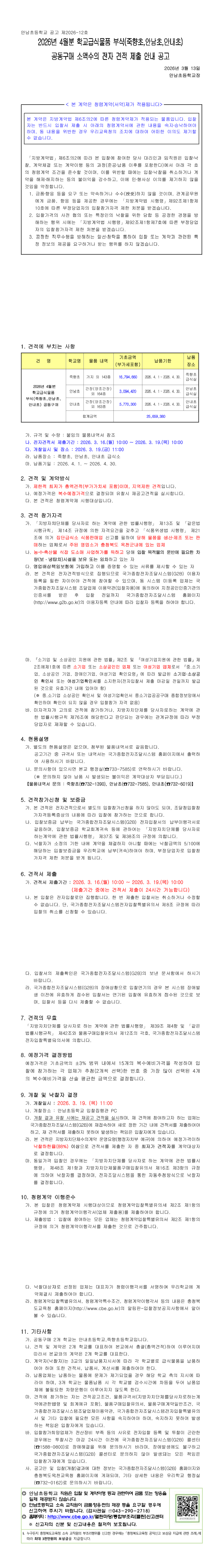 2026년 4월분 학교급식물품 부식(죽향초,안남초,안내초)공동구매 소액수의 전자 견적 제출 안내 공고 |