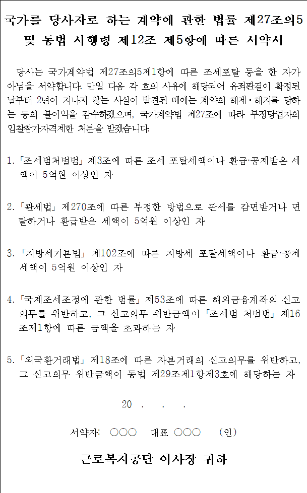 4) 제출한 서류가 허위 또는 부정한 방법으로 작성(제출)된 사실이 확인될 경우에는 관련법규에 따라 계약해지, 부정당업자 제재 등의 처분을 받을 수 있습니다.