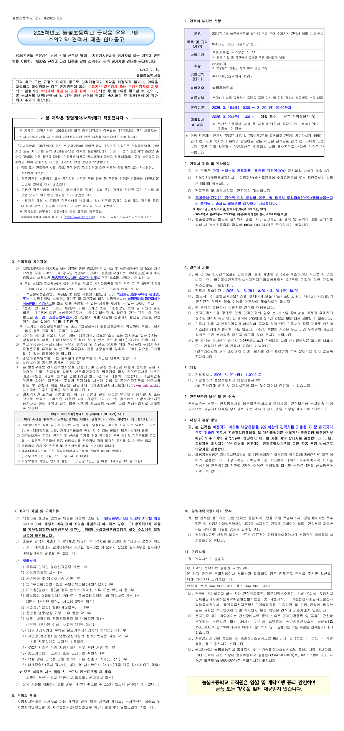 2026학년도 늘봄초등학교 급식용 우유 구매 |