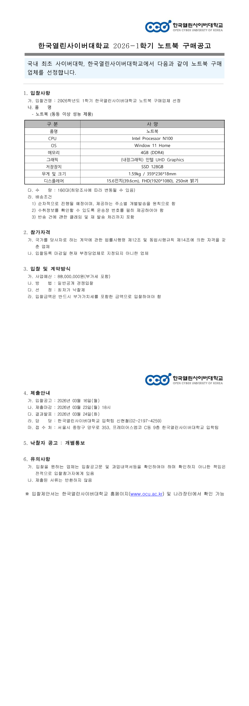 2026-1학기 한국열린사이버대학교 노트북 구매업체 선정 |