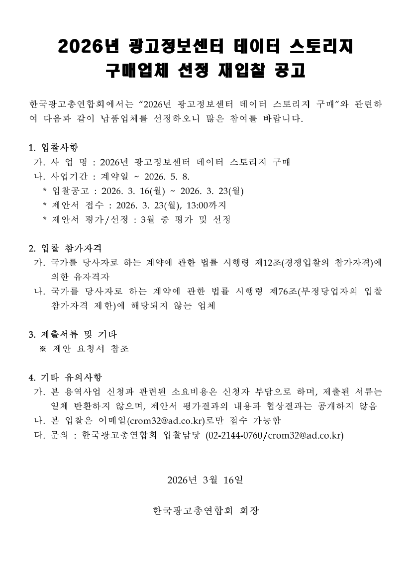 2026년도 광고정보센터 데이터 스토리지 구매 재입찰 |